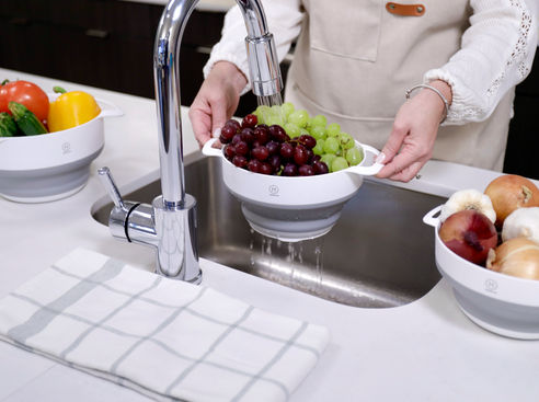Is your kitchen space-starved? Tired of rearranging just to reach your most-needed vessels? These handy nestable colander and bowls collapse down for storage and pop open for all kinds of prep. Wash, mix, and serve in a super-convenient set that works for your space.